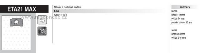 Proč vybrat sáček do vysavače ETA21 MAX z netkané textilie: - Prodloužení životnosti - speciální vícevrstvý materiál sáčku do vysavače zajistí zvýšený sací výkon vysavače i v případě částečného zaplnění sáčku, kdy u papírových sáčků vlivem ucpávání mikropórů výkon vysavače přirozeně klesá = sáček nemusíte tak často měnit.