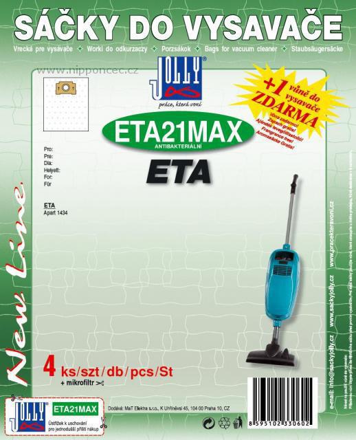 Sáčky do vysavače Jolly ETA21 jsou sáčky náhradní (alternativní) pro vysavače Eta Apart 1434. 4ks sáčků v balení. Sáčky z netkané textilie jsou antibakteriální, součástí balení sáčků je 1x mikrofiltr k nástřihu a vůně zdarma. Sáčky Jolly - s označením MAX - jsou sáčky nové generace s vysokou schopností filtrace.