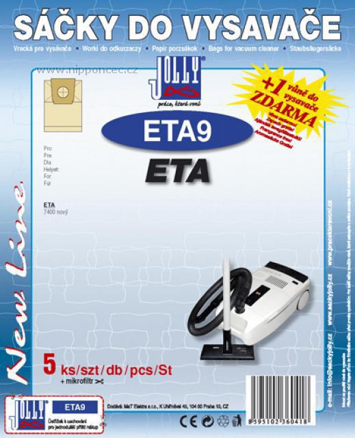 Sáčky JOLLY ETA9 papírové 5ks pro ETA 7400 Jolly ETA9 to je balení 5ks náhradních sáčků pro vysavač ETA 7400 nový tpy a značení Eta8, Vroutecké papírny 7400 NT, z filtračního papíru, součástí balení je 1x vůně zdarma, a 1x mikrofiltr k nástřihu. Sáčky do vysavače Eta9 můžete použít jako náhradní sáčky pro daný typ vysavače. - Sáčky Jolly ETA9 do vysavače Eta 7400 nový typ