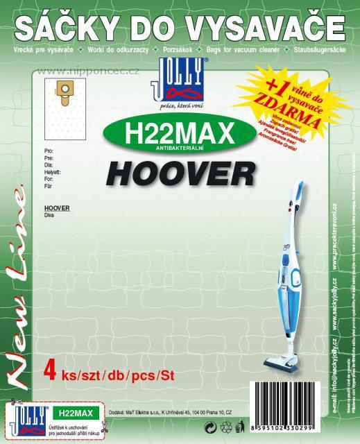 Sáčky do vysavače Jolly H22 MAX textilní antibakteriální 4ks Sáčky do vysavače Jolly H22 MAX jsou sáčky náhradní (alternativní) pro vysavače Hoover Diva, Hoover DF70 DV08011 Hoover DF70 DV11011, Hoover DF71 DV08011, DF71 DV11011, DV 1125 011, DV 1126 011, DV 1129 011, DV 1813 011, DV70 DV15011, DV70 DV20011, DV70 DV30011, DV71 DV15011, Hoover Diva DV71 DV16011, Hoover Diva DV71 DV20011, DV71 DV30011, Hoover Diva DVG 1122 2011, DVG 1122 1011, Hoover H68 Diva, H68A Diva....