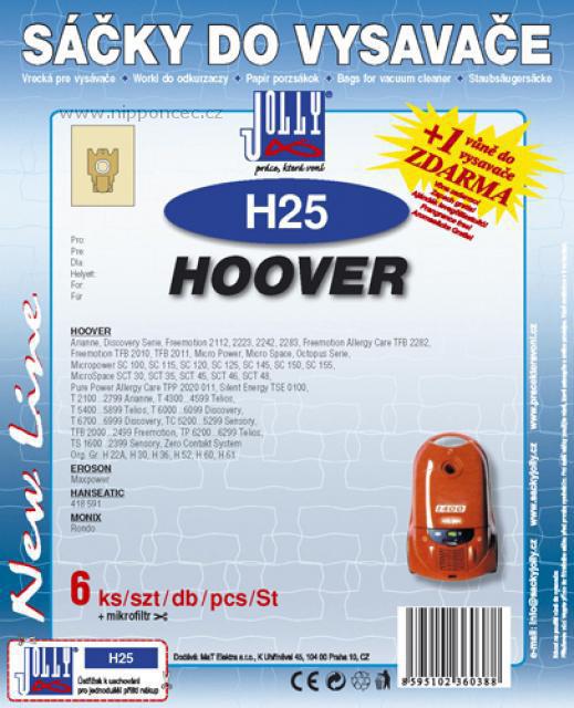 Sáčky do vysavače Jolly H25 papírové 6ks Jolly H25 to je balení 6ks náhradních sáčků kompatibilních pro značení výrobce HOOVER H22, HOOVER H30, HOOVER HOOVER H36, HOOVER H52, HOOVER H60, HOOVER H61, HOOVER H72, HOOVER H73, HOOVER H77, HOOVER H79, HOOVER H83 a určených pro vysavače HOOVER Amigo, HOOVER Arianne, HOOVER Athos, HOOVER Capture, HOOVER Discovery, HOOVER Freemotion, HOOVER Telios Plus, Telios, HOOVER Octopus, Micropower, Purepower HOOVER Sensory, Silent Energy, Space Explorer, Power Capsule a dalších, z filtračního papíru, součástí balení je 1x vůně zdarma, a 1x mikrofiltr k nástřihu. - Sáčky Jolly H25 do vysavače HOOVER a jiných