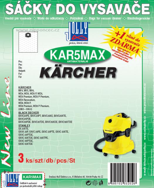 Sáčky do vysavače KAR5 MAX textilní antibakteriální 3ks Jolly KAR5 MAX to je balení 3ks sáčků z netkané textilie s plastovou přírubou, kompatibilních pro značení KÄRCHER 2.863-006.0 a určených pro vysavače KÄRCHER MV 4, MV 4 Premium, MV 5, MV 5 Premium, KÄRCHER MV 6, KÄRCHER MV 6 Premium, KÄRCHER W D4, W D4 Premium, KÄRCHER WD 4 Car Kit, KÄRCHER WD5, KÄRCHER WD5 P, KÄRCHER WD 5 Premium, WD 5P Premium, WD5 Renovation, WD 5 Kärcher, KÄRCHER WD 6 Premium, WD6 P Premium, WD 6 a další vysavače. Součástí balení je i vzorek vůně do vysavače.