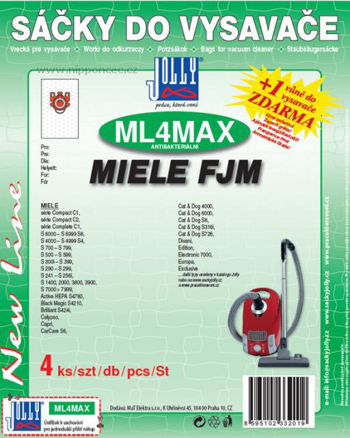 Jolly ML4 MAX to je balení 4ks sáčků z netkané textilie s plastovou přírubou, kompatibilních pro typ MIELE FJM a určených pro vysavače MIELE výrobních řad: MIELE Complete C1, MIELE Compact C1, MIELE Compact C2, MIELE S 241i > 256i, MIELE S 290 > 299, MIELE S 500 > 599 , MIELE S 700 > 799, S 1400, 2000, 3800, 3900, MIELE S 4000 > 4999, MIELE S 6000 > 6999, MIELE S 7000 > 7999 ... Součástí balení je i vzorek vůně do vysavače.