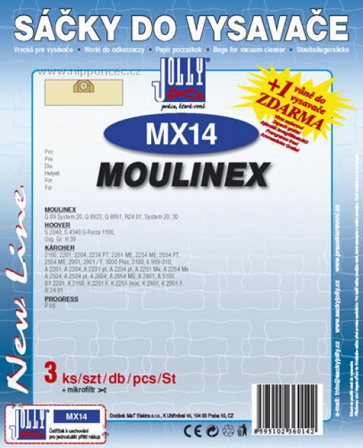 Sáčky do vysavače Jolly MX14 papírové 6ks Jolly MX14 : dodávka 6ks náhradních sáčků pro vysavač Moulinex / Kärcher / Hoover a dalších z filtračního papíru, součástí je mikrofiltr k zastřižení 2ks a 2x vůně. Sáčky do vysavače MX14 můžete použít jako náhradní sáčky do uvedených vysavačů - tyto sáčky jsou alternativou sáčků originálních pro daný typ vysavače.