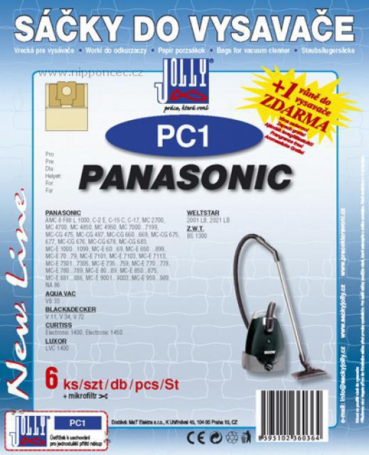 Sáčky do vysavače Jolly PC1 papírové 6ks Balení 6ks náhradních sáčků do vysavačů PANASONIC C-20E, PANASONIC MC CG 463, PANASONIC MC CG 467, PANASONIC MC E 7101, PANASONIC MC E 7101, MC E 7105, MEC E 7111, MC E 7113, PANASONIC MC CG 381, PANASONIC MC -E 7001, PANASONIC MC E 738, PANASONIC MC E 750 až 753 Serie, Značení SWIRL PC-87... a dalších z filtračního papíru, součástí balení je mikrofiltr k zastřižení 1ks a 1x vůně. - Sáčky Jolly PC1 do vysavače Panasonic