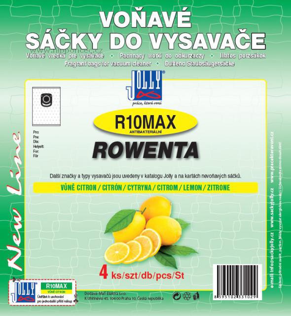 Sáčky Jolly R10 MAX do vysavačů ROWENTA/TEFAL 4ks s citronovou vůní Voňavé sáčky do vysavače Jolly R10 MAX jsou sáčky náhradní (alternativní) pro vysavače ROWENTA/TEFAL. Tyto sáčky jsou kompatibilní pro značení výrobce ROWENTA ZR200540, ROWENTA ZR200520, ROWENTA ZR200720, ROWENTA ZR200740, ROWENTA ZR200920 a určeny pro produktové řady vysavačů ROWENTA Compact Power 3A, ROWENTA Power XXL, ROWENTA Silence Force Compact RO63xx, ROWENTA RO49xx Green Force MAX, ROWENTA Silence Force Compact RO63xx, ROWENTA RO68xx X-Trem Power 3A, ROWENTA RO73xx Silence Force 5*, ROWENTA RO74xx Silence Force Allergy, ROWENTA X-Plorer S65+, ROWENTA X-Plorer S70+, ROWENTA X-Plorer S75S+, ROWENTA X-Plorer S220+, X-Plorer S240+. Sáčky Jolly pro vysavače Rowenta z netkané textilie jsou antibakteriální. Proč vybrat voňavé sáčky do vysavače Jolly R10 MAX z netkané textilie: