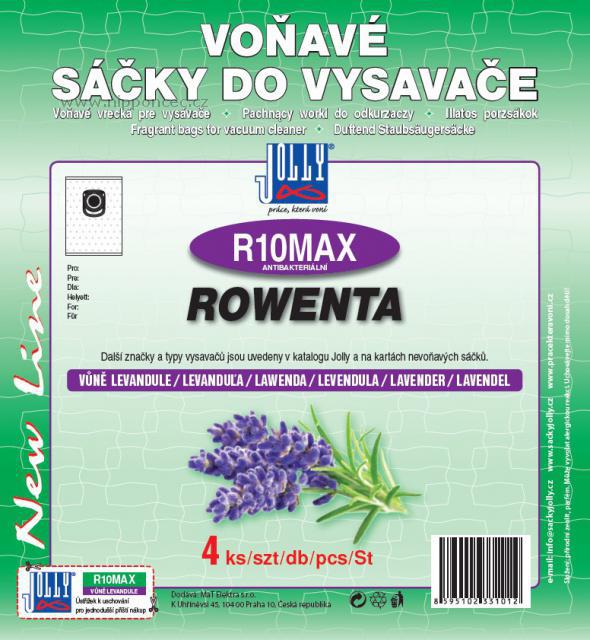 Voňavé sáčky do vysavačů Jolly R10 MAX 4ks s levandulovou vůní Voňavé sáčky do vysavače Jolly R10 MAX jsou sáčky náhradní (alternativní) pro vysavače ROWENTA/TEFAL. Tyto sáčky jsou kompatibilní pro značení výrobce ROWENTA ZR200540, ROWENTA ZR200520, ROWENTA ZR200720, ROWENTA ZR200740, ROWENTA ZR200920 a určeny pro produktové řady vysavačů ROWENTA Compact Power 3A, ROWENTA Power XXL, ROWENTA Silence Force Compact RO63xx, ROWENTA RO49xx Green Force MAX, ROWENTA Silence Force Compact RO63xx, ROWENTA RO68xx X-Trem Power 3A, ROWENTA RO73xx Silence Force 5*, ROWENTA RO74xx Silence Force Allergy, ROWENTA X-Plorer S65+, ROWENTA X-Plorer S70+, ROWENTA X-Plorer S75S+, ROWENTA X-Plorer S220+, X-Plorer S240+. Sáčky Jolly pro vysavače Rowenta z netkané textilie jsou antibakteriální.