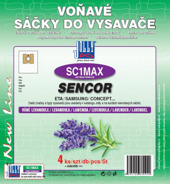 Jolly SC1 MAX voňavé Levandule : balení 4ks náhradních sáčků pro vysavače různých značek z antibakteriální netkané textilie, součástí balení je 1x mikrofiltr - univerzální, k zastřižení. Tyto sáčky jsou kompatibilní pro značení výrobců ETA 960068000 eBAG, ETA 960068010 eBAG, ETA 960068020 eBAG, ETA Unibag č.11, MENALUX 1840, MENALUX 1900, MENALUX 4000, SWIRL Y50. Sáčky jsou vhodné do široké škály různých vysavačů mnoha výrobců: ADLER, AEG, AFK, ALASKA, AMICA, BEEM, BEKO, BESTRON, BLUEL, BOMANN, BONO, BOTTI, BRAVO, BRAVO B 4264 Topaz, CAMRY, CLATRONIC, CONCEPT, CONCEPT VP 8031, CONCEPT VP 8073 Solido, DAEWOO,DAREL, DE SINA, DELONGHI, DIRT DEVIl, DOMO, DURABRAND, E-MATIC, ECG, EC VP 2080S, ECG VP 3120 S, ECRON, EFBE SCHOTT, EIO, EMIDE, ESSENTIEL B, EST, ETA, ETA Canto, ETA Onyx, ETA Rubio, ETA FAGOR, FAKIR, GALLET, GALLETT ASP 301, GALLET ASP 305 Verson, GORENJE, GORENJE VCEA 21 GLPW G-Force Plus, HANSEATIC, HANSEATIC HVBA 8008SKC, HOOVER, HYUNDAI, HYUNDAI VC 003, HYUNDAI VC 004, HYUNDAI VC 005, IMETEC, IDE LINE, KALORIK, KING, LG ELECTRONICS, MEDION, MELISSA, MPM, NILFISK, PRINCESS, PRIVILEG, PROGRESS, PROLINE, ROHNSON, SAMSUNG, SAMSUNG VP 54, SANYO, SCARLETT, SENCOR, SOLAC, SOLAC AB 2700, TAURUS, TESCO, TEAM, TESLA, TIP TOM, TRENDLINE, TRISA, TRISTAR, UFESA, VAX, VITEK, ZANUSSI... pro modely uvedené v sekci "Určeno pro vysavače".. - Jolly SC1 MAX voňavé sáčky do vysavače z netkané textilie