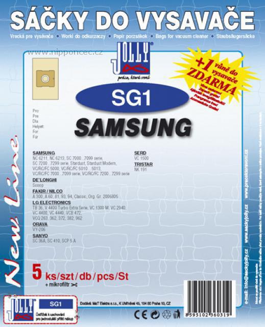 Sáčky do vysavače Jolly SG1 papírové 5ks Jolly SG1 to je balení 5ks náhradních sáčků pro vysavač ECG, LG a Samsung a dalšíchz filtračního papíru, součástí balení je mikrofiltr k zastřižení 1ks, 1x vůně. Sáčky do vysavače SG1 můžete použít jako náhradní sáčky do uvedených vysavačů - tyto sáčky jsou alternativou sáčků originálních pro daný typ vysavače.