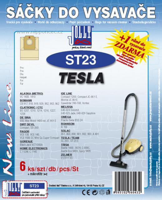 Sáčky do vysavače Jolly ST23 papírové 6ks Jolly ST23 to je balení 6ks náhradních sáčků pro vysavače APOLLO Easy Clean, ALASKA, BESTRON, BLUESKY, BOB HOME, BOMANN CB 952, BOMANN CB 952, CLATRONIC BS 1214, CLATRONIC BS 1216, DIRT DEVILL M 7003 Chubby Berry, DOMIX, ETA 476 Beno, ETA 0473 Capolo, ETA 1476 Beno, ETA Capolo, Značení ETA 36, FAGOR RA 325, FAGOR VCE 1500 SC Mini Go Super Compact, VCH 3311 MiniGo FAGOR, GORENJE VC 1411 B, GORENJE VCK 1300 EA Black Jack, GORENJE VCK 1400 EA Asteroid, G3 FERRARI, HOLLAND ELECTRO, HOME ELECTRONICS, IDE LINE, KALORIK, OMEGA, PROFESSOR JC 816 Bamboo, ROHNSON R 150 Genie, SATURN, SENCOR SVC 65 Boffin, SENCOR SVC 65VT Boffin, SMC, SOLAC, TESLA ST 23, TRISA, UFESA, ZANUSSI ZAN 3002, ZANUSSI ZAN 3002EL, ZANUSSIN ZAN 3010, ZAN 3015 REL, ZELMER XS, ZELMER Dot, kompatibilní pro MENALUX 1942, MENALUX 4600, SWIRL Y104, SWIRL Y24.,různých značek a typů z filtračního papíru, součástí balení je mikrofiltr k zastřižení 1ks, 1x vůně.
