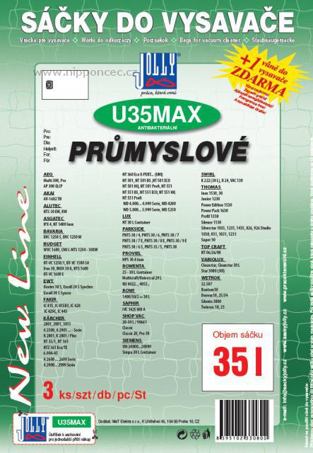 Univerzální sáčky do průmyslových vysavačů Jolly U35 MAX 3ks / 35 litrů Jolly U35 MAX sáčky s obsahem 35 litrů jsou určeny pro i průmyslové vysavače AEG, Alutec, Alfatec, Aqua Vac, Bosch Aqua, Conti, Eihnell, Darel, Electrolux Aqua, EWT, Essentiel B, Kärcher,Rowenta... - U35 MAX univerzální sáčky do průmyslového vysavače z netkané textilie