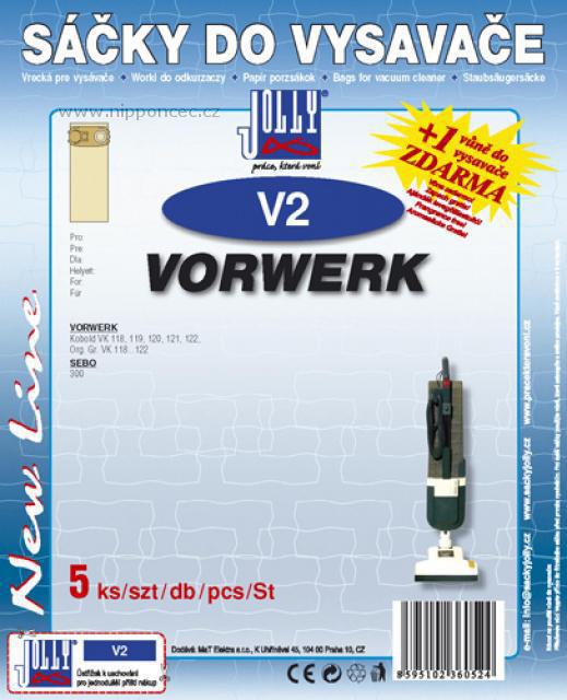 Sáčky do vysavače Jolly V2 papírové 5ks Jolly V2 : balení 5ks náhradních sáčků pro vysavače Vorwerk z filtračního papíru, součástí je vůně do vysavače. Vhodné pro vysavače VORWERK: Folletto VK 118 Folletto VK 119 Folletto VK 120 Folletto VK 121 Folletto VK 122 Kobold VK 118 Kobold VK 119 Kobold VK 120 Kobold VK 121 Kobold VK 122 Org. Gr. FP 118...122 Org. Gr. FP 118...122, VK 118...122 SEBO 300 a jiné. - Sáčky Jolly V2 pro vysavače Vorwerk Kobold VK 118 až 122