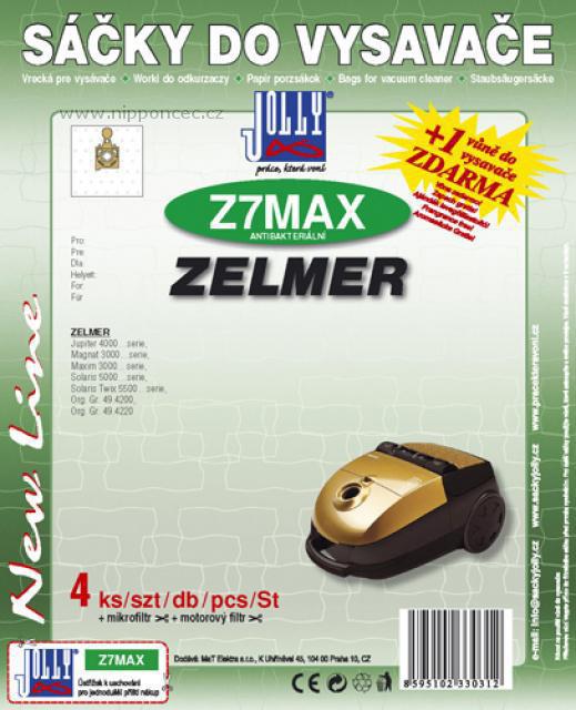 Jolly Z7 MAX to je balení 4 ks náhradních sáčků do vysavačů Zelmer 3000, 4000, 5000, Jupiter, Magnat, Maxim, Solaris, Solaris Twix, Org.Gr. 49.4200, Org. Gr. 49.4220 a dalších , z netkané textilie, antibakteriálních, součástí balení je 1x vůně zdarma, 1x filtr, 1x motorový filtr.