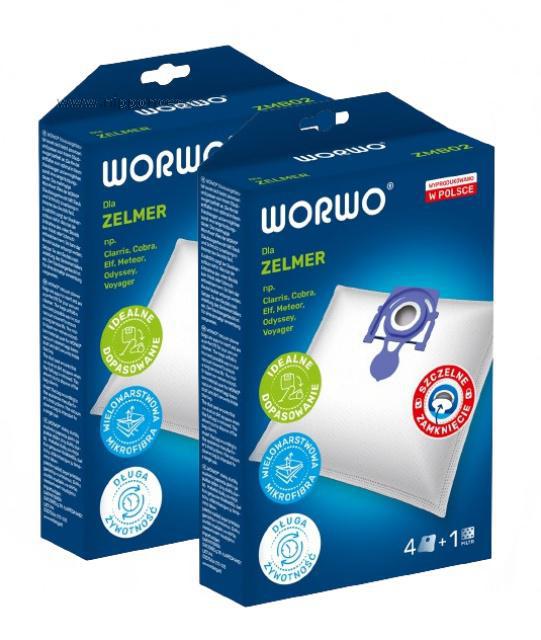 Sáčky pro Zelmer a Bosch AqauWash Clean k vysavačům ZELMER a BOSCH AquaWash & Clean mikrovlákno 8ks Sáčky Worwo ZMB02 (dříve ZMB02K) pro vysavače ZELMER a BOSCH AquaWash & Clean jsou kompatibilní pro značení ZELMER 49.4020, ZELMER 49.400, ZELMER ZVCA100B, ZELMER ZVCA111, JOLLY Z2 MAX, SWIRL Z111, KOMA ZE01PL a jsou určeny pro vysavače BOSCH BWD420HYG, BOSCH BWD421PET, BOSCH BWD421POW, BOSCH BWD421PRO, BOSCH BWD41700, BOSCH BWD41720, BWD41740, ZELMER Aquario, ZELMER Aquos, ZELMER Aquawelt, ZELMER ZELMER Antek, ZELMER Clarris ZELMER Cobra, ZELMER Cobra 2000, ZELMER Elf, ZELMER Flip, ZELMER Flooris, ZELMER Furio 400, ZELMER Meteor 2, ZELMER Odyssey Sáčky k vysavačům Worwo ZMB02 se dodávají po 8ks + 2 filtry k zastřižení, jsou vyrobeny v EU, odfiltrují i allergeny a zadrží prachové částice o velikosti 0,3 mikronu, snižují emisi prachu z vysavače, díky použitému materiálu a technologii svařování ultrazvukem jsou pevné.