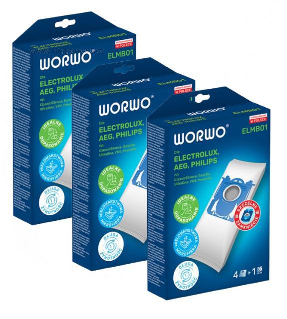 Náhradní sáčky Worwo ELMB01 (dříve ELMB01K) jsou určeny do vysavačů typu Electrolux S-BAG pro vysavače AEG-ELECTROLUX-PHILIPS AirMax, Bolido, Clario, Clario 2, Classic Silence, ErgoSpace, Excelio, Essensio, JetMaxx, Maximus, Oxygen, Oxy3system, UltraSilencer, UltraOne, Viva Control, Viva Quickstop, Philips Autoclean, Ergofit, Jewel, Marathon, Performer, Studio, Specialist, Silent Star, Universe....Kvalitní alternativa originálního výrobku, 12 sáčků a 3 mikrofiltry.