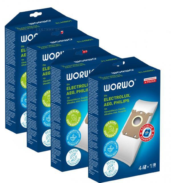 Náhradní sáčky WORWO ELMB01 (dříve ELMB01K) z mikrovlákna jsou určeny pro vysavače AEG-ELECTROLUX-PHILIPS a jsou kompatibilní se značeními produktů Electrolux E200, E200B, E200M, E201B, E201M, E201S, E202, E203, E203S, E206B, E212B, Menalux 1800, Menalux 1800MP, Philips FC8019/01, Philips FC8021/03, Philips FC8022/04, Philips FC8023/04, Swirl E82, Swirl PH86 , 16 sáčků a 4 mikrofiltry. Sáčky Worwo ELMB01 odfiltrují i alergeny, a zadrží prachové částice o velikosti 0,3 mikronu, snižují emisi prachu z vysavače. Díky použitému materiálu a technologii svařování ultrazvukem jsou pevné.