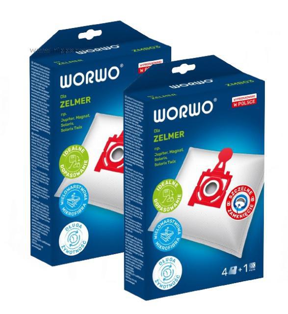 Sáčky do vysavačů Worwo ZMB03 (k Zelmer ZVCA300B) mikrovlákno 8ks Sáčky Worwo ZMB03 (dříve ZMB03K) 8ks v balení a 2x filtr k zastřižení jsou vyrobeny z mikrovlákna - netkané textilie - SMS. Sáčky jsou kompatibilní pro značení výrobců ZELMER 49.4020, ZELMER 49.4220, ZELMER ZVCA300B, SWIRL Z114, KOMA ZE03S, JOLLY Z7 MAX, JOLLY Z7 a jsou určeny pro vysavače ZELMER Jupiter, ZELMER Jupiter 2100W, ZELMER Jupiter 4000, ZELMER Jupiter ZVC425HT, ZELMER Jupiter ZVC427HT, ZELMER Magnat, ZELMER Magnat 3000, ZELMER Maxim, ZELMER Maxim 3000, ZELMER Solaris, ZELMER Solaris 2200, ZELMER Solaris 2200W, ZELMER Solaris 5000, ZELMER Solaris Twix, ZELMER Solaris Twix ZVC552KT, ZELMER ZVC425HT, ZELMER ZVCA300B... Kvalitní náhradní sáčky jsou vyrobeny v EU, odfiltrují i alergeny a zadrží prachové částice o velikosti 0,3 mikronu, snižují emisi prachu z vysavače, díky použitému materiálu a technologii svařování ultrazvukem jsou pevné.