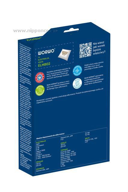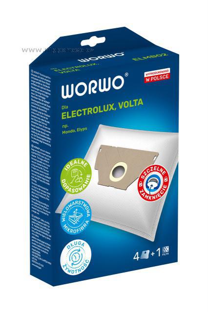 Sáčky do vysavače Worwo ELMB02 mikrovlákno 4ks Sáčky Worwo ELMB02 (dříve ELMB02K) jsou vyrobené z mikrovlákna (netkané textilie, SMS aj.), 4ks v balení a 2ks přesně střižených filtrů. Sáčky do vysavačů z mikrovlákna jsou kompatibilní pro značení ELECTROLUX E44, ELECTROLUX ES49, ELECTROLUX E49N, SWIRL E84, JOLLY E2 MAX a jsou vhodné např. k vysavačům: ELECTROLUX Mondo Z 1100 až 1190, ELECTROLUX Mondo Z 1126, ELECTROLUX Mondo 1128, ELECTROLUX Mondo Z 1161, ELECTROLUX Mondo Z 1176, ELECTROLUX Mondo Z 1190, MIOSTAR, PROGRESS, TORNADO E49, VOLTA Elyps V27a další...Speciální vícevrstvý materiál sáčku do vysavače Worwo ELMB02 zajistí zvýšený sací výkon vysavače i v případě částečného zaplnění sáčku, kdy u papírových sáčků vlivem ucpávání mikropórů výkon vysavače přirozeně klesá = sáček nemusíte tak často měnit. Sáčky z mikrovlákna jsou schopny zachytit prachové částice o velikosti 0,3 mikronu, jejich používáním prodloužíte životnost HEPA filtru vysavače u výstupu vzduchu. Stejně tak je emise prachu z vysavače snížena na 0,01 % . Obecně filtrují mikrovlákenné sáčky až o 40% lépe, než klasický papírový sáček.