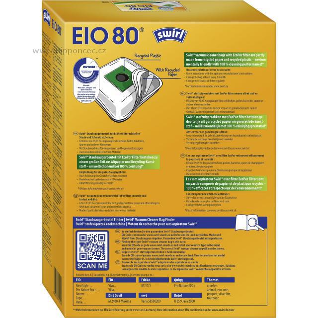 Sáčky do vysavačů Swirl EIO80 z netkané textilie EcoPor ® jsou vyrobeny z recyklovatelného papíru a recyklovatelného plastu - 45-65% materiálu. Jsou šetrné k životnímu prostředí a nabízejí excelentní fitraci 99,99%. Sáčky jsou kompatibilní např. s vysavači Alaska, Eio Compact, Eio Exclusiv, Eio Futura, Eio Serie Vision, Morphy Richards, Thomas a mnoha dalšími.