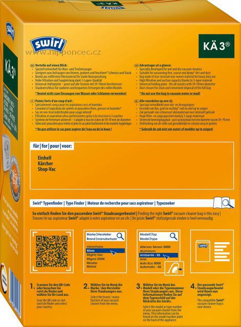 Sáčky do vysavačů Swirl KÄ3 ® z netkané textilie jsou určeny pro průmyslové a hrncové vysavače s kapacitou prachové nádoby o objemu 15-20L. Materiál je z 45-65% zcela recyklovatelný - jsou šetrné k životnímu prostředí a nabízejí výbornou filtraci při vysávání jemných, hrubých nebo vlhkých nečistot. Sáčky Swirl KÄ3 ® byly speciálně vyvinuty pro vysavače s mokro suchým sáním. Materiál sáčků Swirl KÄ3 ® je odolný proti roztržení a ideální pro použití v náročném prostředí ve sklepě, v garáži nebo na zahradě. Sáčky Swirl KÄ3 ® Jsou kompatibilní např. s vysavači Kärcher WD 3, A 2200 až 3199, SE 400, SE 4002, Shop Vac, Parkside a mnoha dalšími.