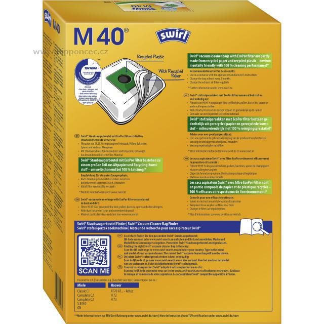 Sáčky do vysavačů Swirl M40 z netkané textilie EcoPor ® jsou vyrobeny z recyklovatelného papíru a recyklovatelného plastu - 45-65% materiálu. Jsou šetrné k životnímu prostředí a nabízejí excelentní fitraci 99,99%. Sáčky jsou kompatibilní např. s vysavači Miele typ GN: Miele Classic C1, Miele Complete C2, Miele Complete C3, Miele S2 Serie (S2000-S2999), Miele S5 (S5000-S5999), Miele S8 (S8000-S8999), Miele S800-S858, Miele S600-S658, S400i-S456i a mnoha dalšími.