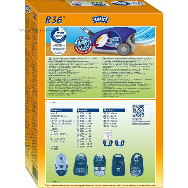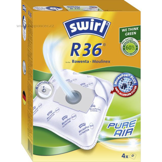 Sáčky do vysavačů Swirl R36 z netkané textilie EcoPor ® jsou vyrobeny z recyklovatelného papíru a recyklovatelného plastu - 45-65% materiálu. Jsou šetrné k životnímu prostředí a nabízejí excelentní fitraci 99,99%. Sáčky jsou kompatibilní např. s vysavači používající typ sáčku Rowenta WB484740, WB406140, Rowenta Artec, Compact Power, Manea, Silence Force Compact, Silence Force, Space, X-Treme Power, RO 3800 až 3899, RO 4100 až 4199, RO 4200 až 4299, RO 4300 až 4399, RO 4400 až 4499, RO 4500 až 4599, RO 4600 až 4900, RO 4700 až 4799, RO 5400 až 5499, RO 5500 až 5599, RO 5600 až 5699, RO 5700 až 5799, RO 5800 až 5899, RO 5900 až 5999 a mnoha dalšími.