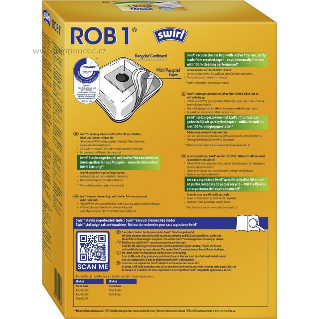 Sáčky do vysavačů Swirl ROB1 z netkané textilie EcoPor ® jsou vyrobeny z recyklovatelného papíru a recyklovatelného plastu - 45-65% materiálu. Jsou šetrné k životnímu prostředí a nabízejí excelentní fitraci 99,99%. Sáčky jsou kompatibilní např. s vysavači iRobot Clean Base, iRobot Roomba i3+, iRobot Roomba i4+, iRobot Roomba i7+, iRobot Roomba S9+ a mnoha dalšími.