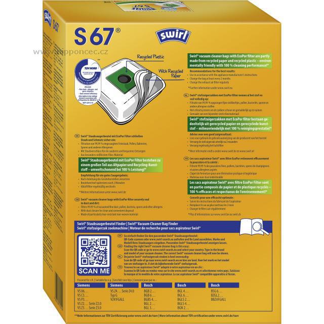 Sáčky do vysavačů Swirl S67 z netkané textilie EcoPor ® jsou vyrobeny z recyklovatelného papíru a recyklovatelného plastu - 45-65% materiálu. Jsou šetrné k životnímu prostředí a nabízejí excelentní fitraci 99,99%. Sáčky jsou kompatibilní např. s vysavači, využívající typ sáčku Bosch a Siemens typ G, BBZ41FG, BBZ41FGALL k vysavačům Bosch GL20, Bosch GL30, Bosch GL45, BBS, BGB2,BGB45m BGB6, BGB7, BGL8, BGL2, BGL3, BGL35, BGL6, BGL7, BGL8, BGLS2, BGLS4, BGLS45, BGLS4X, BSA, BBS, BSC, BSD, BSG6, BSG7, BSGL2, BSGL3, BSGL4, BSGL5 Serie.....