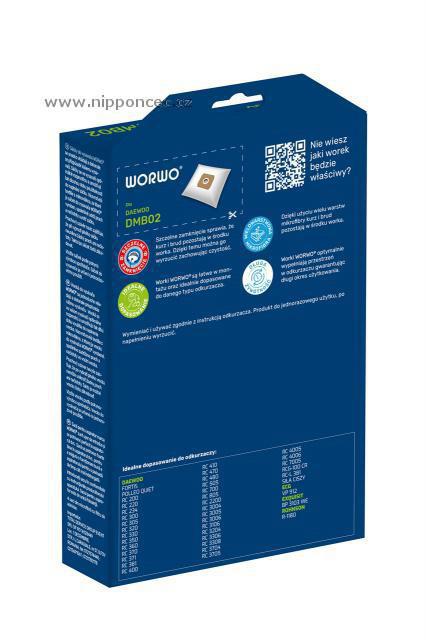 Sáčky DMB02 Worwo (dříve DMB02K) jsou vyrobeny v EU z mikrovlákna (netkaná textilie), 8ks sáčků v dodávce a 2x filtr k nástřihu. Tyto sáčky jsou kompatibilní pro značení MENALUX 4200, MENALUX CT179, SWIRL Y100, JOLLY D3 MAX, DAEWOO SB70, DAEWOO SB80, DAEWOO SB200, ELECTROLUX ES66, ELECTROLUX E66N, ELECTROLUX E62N a jsou určeny pro vysavače DAEWOO DWC 112DR/A, DAEWOO Fortis, DAEWOO RC220 Y/RD, DAEWOO RC220YL, DAEWOO RC300, DAEWOO RC3106BR, DAEWOO RC3204, DAEWOO RC3704, DAEWOO RCL381M, ECG VP912 a další vysavače zde uvedené, pro různé modely výrobců AIRLO, CHROMEX, CLATRONIC, CONDEL, CURTISS, DAMIK, DE SINA, DE LONGHI, DICAFF, DILEM, DOMO, E-MATIC, ECG, EFBE SCHOTT, ELECTROLUX, ELTA, ESSENTIEL B, FAGOR, FIF, FIRST AUSTRIA, GIRMI, GLENAN, GOBLIN, GOODMANS, GRUNDIG, HANSEATIC, KAISKI, KALORIK, KAMBROOK, LECERC, LLOYDS, MEDION, MELISSA, MIA, MONIX, MORGANS, NETTO, NILFISK, NOVAMATIC, PROGRESS, SALCO, SANYO, SEAWAY, SOLAC, SPEED, SUPPORT PLUS, TAURUS, TESLA, THE BOSS, TORNADO, TRISA, UFESA, VACGANGE, VOLTA, WHITE BROWN. Kvalitní příruba, textilní sáčky. Tyto sáčky do vysavačů široké škály odfiltrují i alergeny, a zadrží prachové částice o velikosti 0,3 mikronu, snižují emisi prachu z vysavače. Díky použitému materiálu a technologii svařování ultrazvukem jsou pevné.