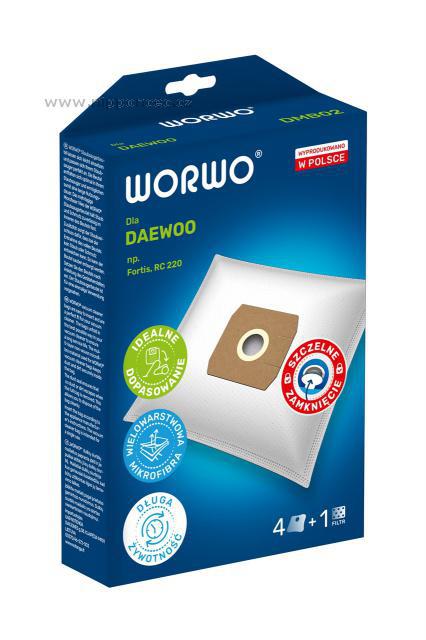 Sáčky DMB02 Worwo (dříve DMB02K) jsou vyrobeny v EU z mikrovlákna (netkaná textilie), 4 ks sáčků v balení a filtr k nástřihu jsou kompatibilní pro značení MENALUX 4200, MENALUX CT179, SWIRL Y100, JOLLY D3 MAX, DAEWOO SB70, DAEWOO SB80, DAEWOO SB200, ELECTROLUX ES66, ELECTROLUX E66N, ELECTROLUX E62N a jsou určeny pro vysavače DAEWOO DWC 112DR/A, DAEWOO Fortis, DAEWOO RC220 Y/RD, DAEWOO RC220YL, DAEWOO RC300, DAEWOO RC3106BR, DAEWOO RC3204, DAEWOO RC3704, DAEWOO RCL381M, ECG VP912 a další vysavače zde uvedené, pro různé modely výrobců AIRLO, CHROMEX, CLATRONIC, CONDEL, CURTISS, DAMIK, DE SINA, DE LONGHI, DICAFF, DILEM, DOMO, E-MATIC, ECG, EFBE SCHOTT, ELECTROLUX, ELTA, ESSENTIEL B, FAGOR, FIF, FIRST AUSTRIA, GIRMI, GLENAN, GOBLIN, GOODMANS, GRUNDIG, HANSEATIC, KAISKI, KALORIK, KAMBROOK, LECERC, LLOYDS, MEDION, MELISSA, MIA, MONIX, MORGANS, NETTO, NILFISK, NOVAMATIC, PROGRESS, SALCO, SANYO, SEAWAY, SOLAC, SPEED, SUPPORT PLUS, TAURUS, TESLA, THE BOSS, TORNADO, TRISA, UFESA, VACGANGE, VOLTA, WHITE BROWN. Kvalitní příruba, textilní sáčky. Tyto sáčky do vysavačů široké škály odfiltrují i alergeny, a zadrží prachové částice o velikosti 0,3 mikronu, snižují emisi prachu z vysavače. Díky použitému materiálu a technologii svařování ultrazvukem jsou pevné.