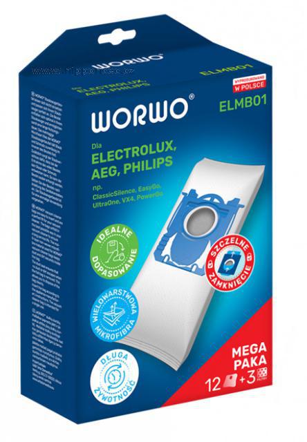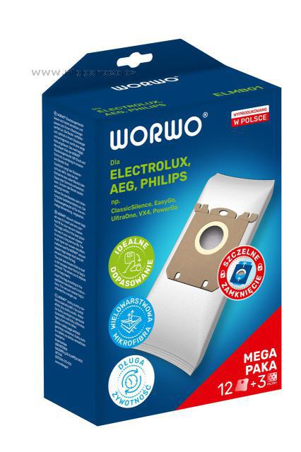 Sada náhradních sáčků Worwo ELMB01 (dříve ELMB01K) a HEPA filtru je určena pro vysavače AEG-ELECTROLUX-PHILIPS a nahrazuje značení produktů: HEPA filtr Electrolux EFH12, EFH12W, EFH13W, AEG AFS1W, Philips FC8031, FC8038 a sáčky s-bag Electrolux E200, E200B, E200M, E201B, E201M, E201S, E202, E203, E203S, E206B, E212B, Menalux 1800, Menalux 1800MP, Philips FC8019/01, Philips FC8021/03, Philips FC8022/04, Philips FC8023/04, Swirl E82, Swirl PH86.. Sáčky a HEPA filtr jsou určeny pro vysavače AEG -ELECTROLUX: AirMax/GREEN, Bolido, Clario, Clario2, ErgoSpace/GREEN, Essensio, Excellio, JetMaxx, Maximus, Mondo Plus, Oxy3system, Oxygen, Oxygen+, Superpro, UltraOne, UltraSilencer, Viva Control, Viva Quickstop, PHILIPS: EasyLife, Expression, HomeHero, Impact, Jewel, Mobilo,Performer, Performer Compact, PerformerPro, PowerLife, SilentStar, SmallStar, Specialist, Studio, Universe, PerformerActive, Performer Expert
