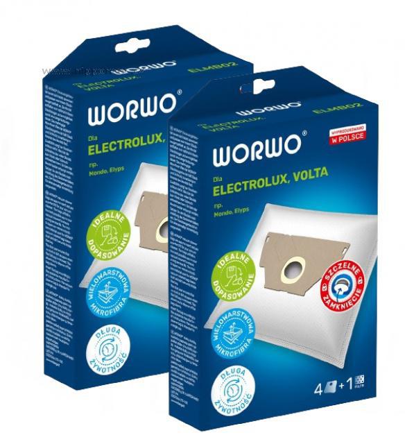 Sáčky do vysavače Worwo ELMB02K 8ks Sáčky Worwo ELMB02 (dříve ELMB02K) jsou vyrobené z mikrovlákna (netkané textilie, SMS aj.), 4ks v balení a 2ks přesně střižených filtrů. Sáčky do vysavačů Electrolux, Tornado, Mio Star... jsou kompatibilní pro značení ELECTROLUX E44, ELECTROLUX ES49, ELECTROLUX E49N, SWIRL E84, JOLLY E2 MAX a jsou vhodné např. k vysavačům: ELECTROLUX Mondo Z 1100 až 1190, ELECTROLUX Mondo Z 1126, ELECTROLUX Mondo 1128, ELECTROLUX Mondo Z 1161, ELECTROLUX Mondo Z 1176, ELECTROLUX Mondo Z 1190, MIOSTAR, PROGRESS, TORNADO E49, VOLTA Elyps V27a další...Speciální vícevrstvý materiál sáčku do vysavače Worwo ELMB02K zajistí zvýšený sací výkon vysavače i v případě částečného zaplnění sáčku, kdy u papírových sáčků vlivem ucpávání mikropórů výkon vysavače přirozeně klesá = sáček nemusíte tak často měnit. Sáčky z mikrovlákna jsou schopny zachytit prachové částice o velikosti 0,3 mikronu, jejich používáním prodloužíte životnost HEPA filtru vysavače u výstupu vzduchu. Stejně tak je emise prachu z vysavače snížena na 0,01 % . Obecně filtrují mikrovlákenné sáčky až o 40% lépe, než klasický papírový sáček.