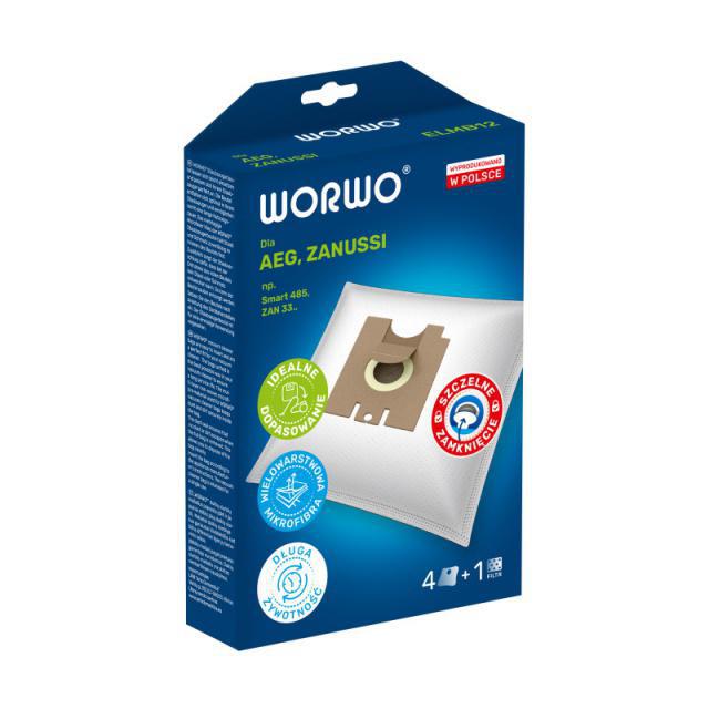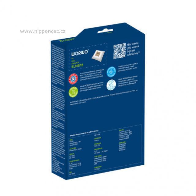 Sáčky Worwo ELMB12 pro AEG, Concept, Hoover Zanussi, mikrovlákno 4ks Tyto náhradní sáčky jsou kompatibilní pro značení Hoover H58, Hoover H63, Hoover H64, SWIRL Y351, ELECTROLUX E59, a jsou určeny pro vysavače AEG Smart, Electrolux Powerlite, Hoover Capture TCP 1805, TCP 2005, TCP 2010, TCP 2011, Hoover Flash TF 1605, TF 1805, TF 2005, TF 2006, TF 2011, TFS 1805, Hoover Freespace TFS 5100 až 5198, Hoover Freespace TFS 5200 až 5209, Hoover Freespace Evo TFV 2014B, Hoover Sprint TW 1545, TW 1550, TW 1560, TW 1570, TW 1650, TW 1660, TW 1670, TW 1680, Zanussi Zan 3310, ZAN 3319... Sáčky Worwo ELMB12 jsou vyrobeny v EU, odfiltrují i allergeny a zadrží prachové částice o velikosti 0,3 mikronu, snižují emisi prachu z vysavače, díky použitému materiálu a technologii svařování ultrazvukem jsou pevné. Speciální vícevrstvý materiál sáčku do vysavače zajistí zvýšený sací výkon vysavače i v případě částečného zaplnění sáčku, kdy u papírových sáčků vlivem ucpávání mikropórů výkon vysavače přirozeně klesá = sáček nemusíte tak často měnit.