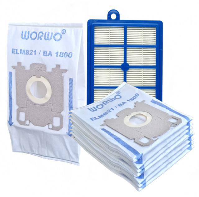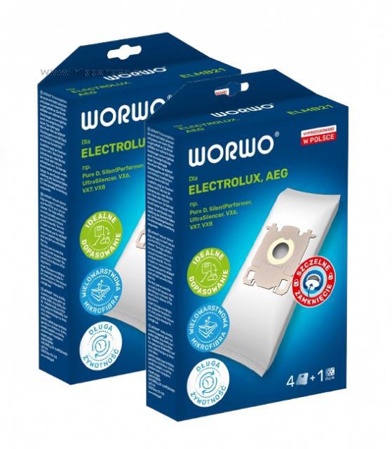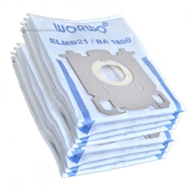 Sáčky Worwo ELMB21 jsou sáčky typu s-bag do vysavačů AEG-ELECTROLUX-PHILIPS, kompatibilní pro značení výrobců ELECTROLUX s-bag E201, E201S, E203, E206, E210, PHILIPS s-bag . Tento nový typ sáčku je určen pro nové vysavače AEG-ELECTROLUX produktových řad AEG VX6 Serie, AEG VX7 Serie, AEG VX8 Serie, AEG VX9 Serie, ELECTROLUX ECS5...Classic Silence, ELECTROLUX EEG4....EasyGo, ELECTROLUX EPF6...Power Force, ELECTROLUX ESP7...Silent Performer, ELECTROLUX EUS8.... New UltraSilencer, ELECTROLUX EUSC6...New UltraSilencer, ELECTROLUX PD82...Pure D8, ELECTROLUX PD91....Pure D9 Serie, PHILIPS 3000 Series, PHILIPS 5000 Series, PHILIPS 6000 Series, PHILIPS 8000 Series. Balení obsahuje 4ks sáčků a 1 univerzální mikrofiltr k zastřižení. Speciální vícevrstvý materiál sáčků zajisti zvýšený sací výkon i v případě částečného zaplnění sáčku. Vynikající filtrační vlastnosti - sáčky z mikrovlákna zachytí prachové částice o velikosti 0,3 mikronu, jejich používáním prodloužíte životnost HEPA filtru. Materiál použitý na textilní sáčky je pružný, dobře se přizpůsobí velikosti prachové komory vysavače.