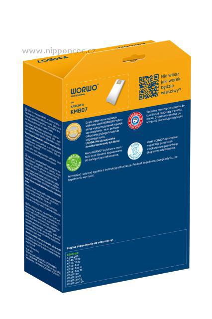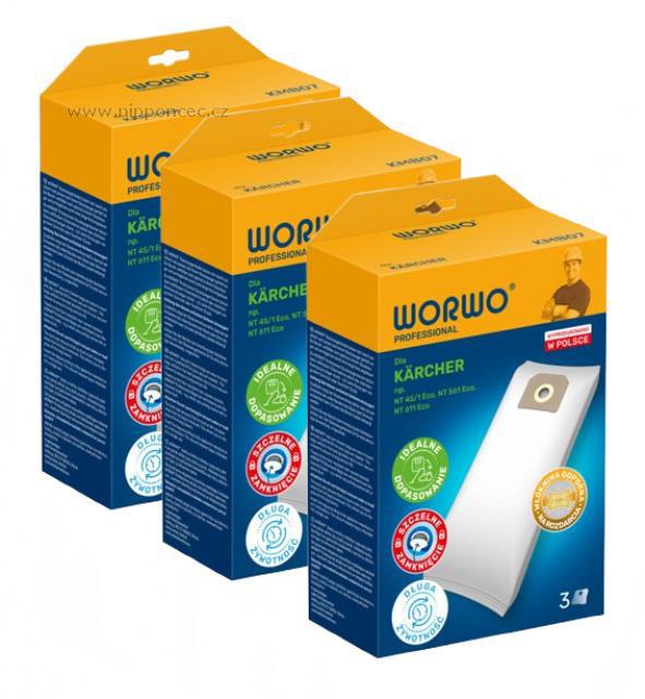Průmyslové sáčky WORWO KMB07 , dříve KMB07W jsou vhodné pro řadu profesionálních vysavačů mnoha typů i značek. Tyto sáčky odfiltrují i alergeny, a zadrží prachové částice o velikosti 0,3 mikronu, snižují emisi prachu z vysavače. Díky použitému materiálu a technologii svařování ultrazvukem jsou pevné. Kompatibilní jsou např. pro vysavače BOSCH GAS 35, FESTOOL SRM 45, FLEX VC 21, FLEX VC 35, HILTI VC 40, HILTI VC 60, KÄRCHER NT 35/1, KÄRCHER NT 40/1, KÄRCHER NT 45/1, KÄRCHER NT 65/2, KÄRCHER NT 70/2, KÄRCHER NT 75/2, KÄRCHER NT /80/1, MAKITA 447, MAKITA P-72899 kompatibilní, MAKITA VC 2512 L, VC 3011 L, MAKITA VC 3012 LX, METABO ASA 25 L PC, MILWAUKEE AS 42 MAC, NAREX VYS 30-21, NAREX VYS 30-71, NAREX VYS 33-71, WÜRTH - ISS-45-M, ISS-55-S ....a další modely a značky vysavačů.Sáčky jsou vyrobeny z netkané textilie (mikrovlákna), 6 sáčků v dodávce.