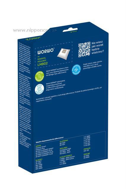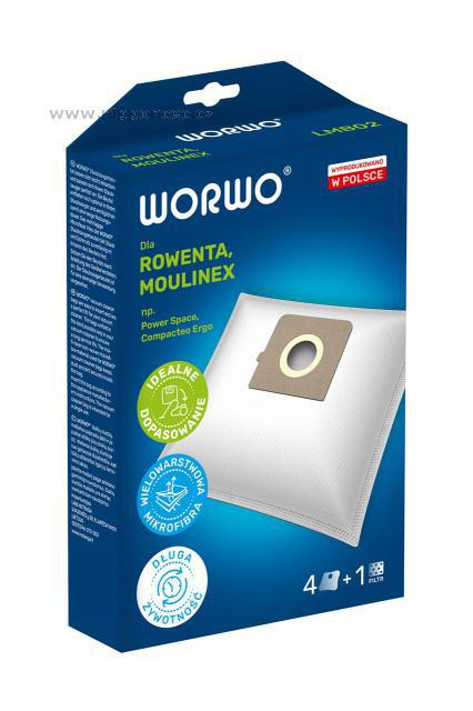 Náhradní sáčky do vysavačů Worwo LMB02 (dříve LMB02K) jsou jsou vyrobeny v EU z mikrovlákna (netkaná textilie) 4 ks sáčků v balení a filtr k nástřihu. Tyto sáčky do vysavače odfiltrují i alergeny, a zadrží prachové částice o velikosti 0,3 mikronu, snižují emisi prachu z vysavače. Díky použitému materiálu a technologii svařování ultrazvukem jsou pevné. Jsou vhodné pro vysavače Clatronic BS 1224, BS 1231, Elettrozeta 09781, Gold Star VCP Serie, Hyundai VC 310, LG Electronics V3314 Turbo, LG VB 2716 NRTQ, LG VB 2718 NRTQ , LG VC 3A55, LG VCA 683, LG VCP 243, LG VCP 243 RDN, VCP 663, LG VCP 963, LG VCP 963 STQ, LG VCP 983 STQB, LG VK 89682 HU, Solac A 602, A604, A 609, Solac Magnum 2000, SWIRL Y30...