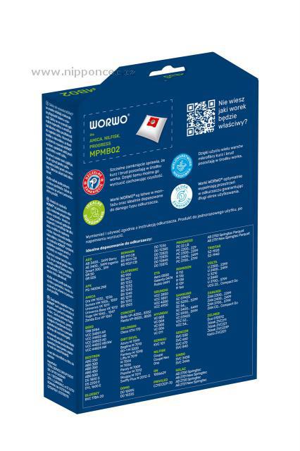 Sáčky Worwo MPMB02 (dříve MPMB02K) jsou vyrobeny v EU z mikrovlákna (netkaná textilie) 16 ks sáčků v dodávce a 4x filtr k nástřihu. Sáčky jsou kompatibilní pro značení výrobců ETA 9600 68030 eBag Mini, JOLLY SC1 MAX, JOLLY SC1, MENALUX 4000, SWIRL Y50 a jsou vhodné pro širokou škálu modelů vysavačů mnoha výrobců : Adler, Amica Beko, Bob Home, Bomann Bravo, Botti, Camry, Clatronic, Concept, Daewoo, DeLonghi, Dirt Devil, Domo, ECG, ETA, Fagor, Gallet, Goddess, Gorenje, Hyundai, Hausmeister, Progress, Proline, Rohnson, Samsung, Sencor, Silvercrest, Severin, Solac, Switch On, Taurus, Tesco, Tesla, Tristar, Vitek, Vivax, Zanussi... Tyto sáčky odfiltrují i alergeny, a zadrží prachové částice o velikosti 0,3 mikronu, snižují emisi prachu z vysavače. Díky použitému materiálu a technologii svařování ultrazvukem jsou pevné.