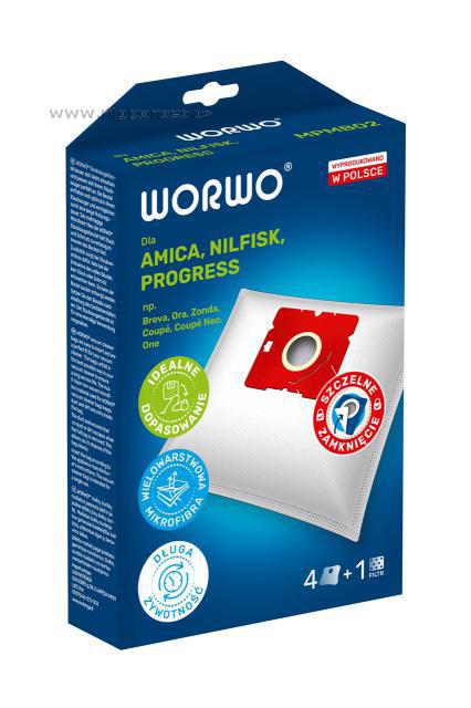 Náhradní sáčky WORWO MPMB02 (dříve MPMB02K) jsou vhodné do široké škály různých vysavačů mnoha výrobců ADLER, ALASKA, AMICA, ARIETE, BEKO, BOB HOME, BOMANN, BONO, BRAVO, CAMRY, CLATRONIC, CONCEPT, DAEWOO, DELONGHI, DIRT DEVIL, DOMO,ECG, ETA, FAGOR, GALLET, FIRST, GORENJE, GUZZANTI, HITACHI, HYUNDAI, NILFISK, PHILIPS, PROGRESS, PRIVILEG, PROLINE, ROHNSON, SENCOR,SEVERIN, SILVERCREST, SOLAC, SWITCH ON, TESLA, TRISTAR, VITEK, VIVAX.... Sáčky jsou vyrobeny v EU z mikrovlákna (netkaná textilie) 4 ks sáčků v balení a 1x filtr k nástřihu. Tyto sáčky do vysavače odfiltrují i alergeny, a zadrží prachové částice o velikosti 0,3 mikronu, snižují emisi prachu z vysavače. Díky použitému materiálu a technologii svařování ultrazvukem jsou pevné.