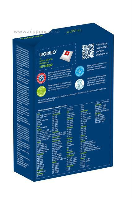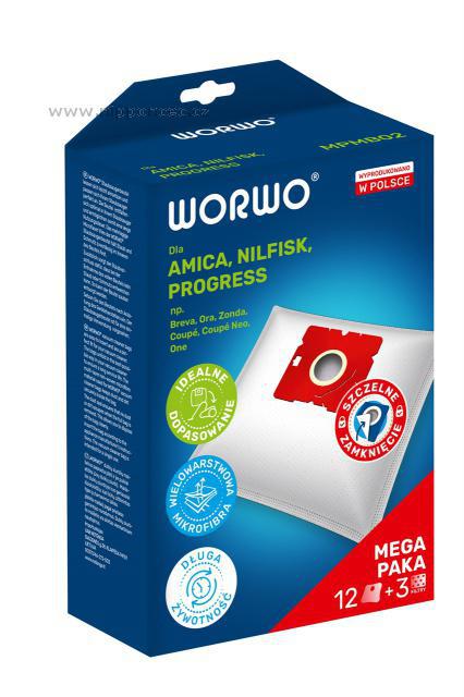 Sáčky do vysavačů Worwo MPMB02X12 12ks Sáčky Worwo MPMB02 (dříve MPMB02K) z netkané textilie jsou vhodné do široké škály různých vysavačů mnoha výrobců: Alaska, Amica, Ariete, Bomann, Clatronic/CTC, Daewoo, DeLonghi, Dirt Devil, Domo, ECG, Electrolux, ETA, Fagor, Grundig, Hitachi, Hoover, Hyundai, Imetec, Philips, Progress, Proline, Sencor, Severin, Solac, VAX, Zanussi a další. Sáčky jsou vyrobeny v EU z mikrovlákna (netkaná textilie) 12 ks sáčků v balení a filtr k nástřihu. Mikrovlákenné sáčky do vysavače odfiltrují i alergeny, a zadrží prachové částice o velikosti 0,3 mikronu, snižují emisi prachu z vysavače. Díky použitému materiálu a technologii svařování ultrazvukem jsou pevné.