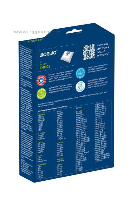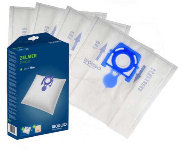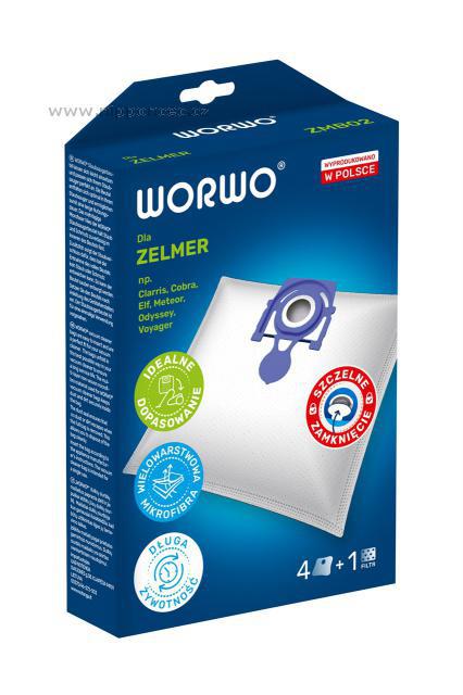 Sáčky do vysavače Worwo ZMB02 mikrovlákno 4ks Sáčky Worwo ZMB02 (dříve ZMB02K) pro vysavače Zelmer a BOSCH AquaWash & Clean jsou kompatibilní pro značení ZELMER ZVCA100B, BOSCH BBZWD4BAG, SWIRL Z111 a jsou určeny pro vysavače BOSCH AquaWash & Clean BWD420HYG, BWD421PET, BWD421POW, BWD421PRO, BWD41700, BWD41720, BWD41740, ZELMER Active Go, ZELMER Aquario, ZELMER Aquos, ZELMER Aquawelt, ZELMER Aeromaster, Aeroplus, ZELMER Antek, ZELMER Aquos, Aquario, Aquawelt, ZELMER Clarris 2700, ZVC341, ZVC345, ZVC345, ZELMER Clarris Twix, ZELMER Cobra, Cobra 2000, Cobra 2000 Plus, Cobra 2010 ZELMER DOT ZELMER Delfin, ZELMER Elf, Elf 2, Elf 3 ZELMER Explorer 1100 ZELMER Flip 321, Flip 322, ZELMER Flooris VC1006, Flooris ZVC541, ZVC542, ZVC545 Flooris ZELMER Furio 400 ZELMER Meteor 2 400, Meteor 2 ZVC212, ZVC215, ZELMER Odyssey 450, Odyssey ZVC302, ZVC305 ZELMER Protecto ZELMER Roto, ZELMER Silentwelt ZELMER Voyager Twix Sáčky se dodávají po 4ks + 1 filtr k zastřižení, jsou vyrobeny v EU, odfiltrují i allergeny a zadrží prachové částice o velikosti 0,3 mikronu, snižují emisi prachu z vysavače, díky použitému materiálu a technologii svařování ultrazvukem jsou pevné.