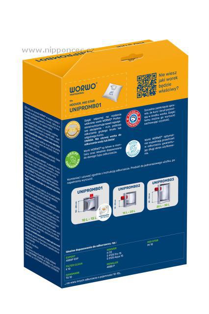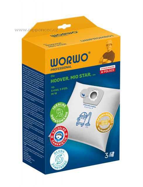 Univerzální průmyslové sáčky pro vysavače Worwo UNIPROMB01 Professional 3ks 10-15L objem Univerzální sáčky do průmyslových vysavačů Worwo UNIPROMB01 Professional mají kapacitu 10-15L. Sáčky Professional jsou vícevrstvé sáčky do průmyslového vysavače, odfiltrují i alergeny, a zadrží prachové částice o velikosti 0,3 mikronu, snižují emisi prachu z vysavače. Díky použitému materiálu a technologii svařování ultrazvukem jsou pevné. Tento druh sáčků je vhodný pro profesionální užití - využijete při průmyslovém vysáváním, stejně tak při rekonstrukci, náročném úklidu, výstavbě apod. Tyto sáčky jsou určeny např. k vysavačům AQUA VAC, ASIST AE7V120-15F, BAVARIA BVC 1815, BLACK DECKER BXVC15PE, BLAUPUNKT VCI201, BOHMAN 15 SWD, EINHELL 23.511.59, EINHELL 23.511.65, EINHELL 23.511.85, EINHELL NTS 12, EINHELL TC-VC 18/15, EINHELL TC-VC 18/20, ETA Neptun, FESTOOL, FILTER CLEAN, GÜDE NTS12, HANSMARK TG10, HOOVER H33, kompatibilní pro KÄRCHER 2.863-297.0, KÄRCHER 2.863-325.0, KÄRCHER 6.904-406.0, KÄRCHER 6.904-407.0, KÄRCHER 6.907-469.0, KÄRCHER NT 14/1, PARKSIDE PWD 12A1, NILFISK Buddy II 12, PROTOOL VCP 170 E, VPC 171, ROWENTA RD 200, ROWENTA RU01 až RU46, SCHEPPACH NTS 16, SHOP VAC Micro 10, SPARKY VC 1600 AF, STIHL SE 33, WAP ST 10, Značení MENALUX 4888P, Značení SWIRL KÄ2....a k dalším vysavačům - všude tam, kde vyhovují rozměrem příruby a obsahem. Původní označení WORWO UNIPROMB01K.