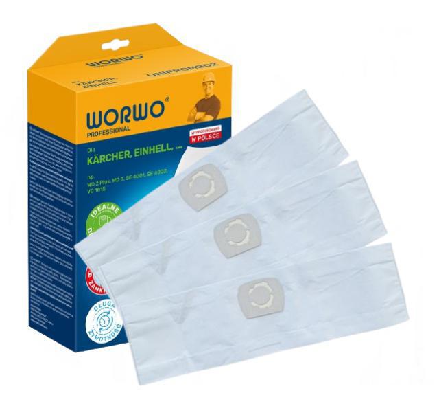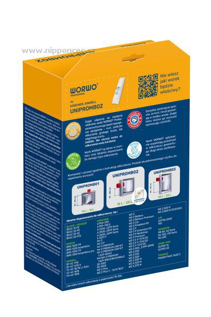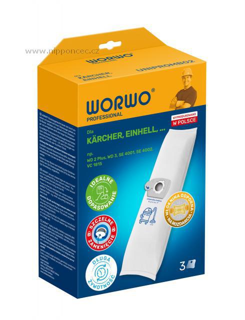 Univerzální průmyslové sáčky pro vysavače Worwo UNIPROMB02 Professional 3ks 15-20L objem Univerzální sáčky do průmyslových vysavačů mají kapacitu 15-20L. Sáčky Worwo Professional jsou vícevrstvé sáčky do průmyslového vysavače, odfiltrují i alergeny, a zadrží prachové částice o velikosti 0,3 mikronu, snižují emisi prachu z vysavače. Díky použitému materiálu a technologii svařování ultrazvukem jsou pevné. Tento druh sáčků je vhodný pro profesionální užití - využijete při průmyslovém vysáváním, stejně tak při rekonstrukci, náročném úklidu, výstavbě apod. Tyto sáčky jsou určeny např. k vysavačům: ADLER, AEG AP 200, ALDI Workzone 12L, AQUA VAC, ARO, ASIST, BAUHAUS Herkules 15, BLACK Decker Franz, BOHMAN 15SWD, BOSCH GAS 11-21, BOSCH GAS 12-25, BOSCH GAS 15, BOSCH PAS 1000, BOSCH PAS 850, CAMRY CR 7045, EINHELL BT-VC 1115, EINHELL TC-VC 1812, FAKIR SE 28, GHIBLI S90BP, GISOWATT Brico, HECHT 8212, HIKOKI WDE 1200, HILTI TDA VC 20, HITACHI WDE 1200, HOOVER H26, HOOVER H39, kompatibilní s KÄRCHER 2.863-314.0, KÄRCHER 6.904-058.0, KÄRCHER 6.904-123.0, KÄRCHER 6.959-130.0, KÄRCHER A 1000, A 2236 X, A 2251, A 2700, K 2801, KÄRCHER NT 20/1, KÄRCHER NT 25/1, KÄRCHER WD 2, KÄRCHER WD 3, MAKITA VC 2012L, MATRIX VCV 1400-20L, METABO AS 1200, MILWAUKEE AS2-250 ELCP, NAREX kompatibilní pro FB VYS 20, FB VYS 21/25, NILFISK Aero 20, NILFISK Buddy 18, PROMA PPIO 1400/20, PROTOOL kompatibilní pro FB-VCP 250, VCP 260, SCHEPPACH 16L, NTS 20, SHOP VAC Super 22, STIHL SE 33, WAP Alto Saltix....a další, zde uvedené. Původní označení sáčku Worwo UNIPROMB02K.