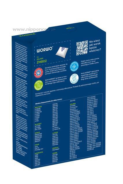 Sáčky do vysavače Worwo ZMB02 mikrovlákno 14ks Sáčky pro vysavače Worwo ZMB02X12 pro vysavače z mikrovlákna jsou kompatibilní pro značení ZELMER 49.4020, ZELMER 49.400, ZELMER ZVCA100B, ZELMER ZVCA111, JOLLY Z2, JOLLY Z2 MAX, SWIRL Z111, KOMA ZE01PL a jsou určeny pro vysavače BOSCH AquaWash & Clean BWD420HYG, BWD421PET, BWD421POW, BWD421PRO, BWD41700, BWD41720, BWD41740, ZELMER Active Go, ZELMER Aquario, ZELMER Aquos, ZELMER Aquawelt, ZELMER Aeromaster, Aeroplus, ZELMER Antek, ZELMER Aquos, Aquario, Aquawelt, ZELMER Clarris 2700, ZVC341, ZVC345, ZVC345, ZELMER Clarris Twix, ZELMER Cobra, Cobra 2000, Cobra 2000 Plus, Cobra 2010 ZELMER DOT ZELMER Delfin, ZELMER Elf, Elf 2, Elf 3 ZELMER Explorer 1100 ZELMER Flip 321, Flip 322, ZELMER Flooris VC1006, Flooris ZVC541, ZVC542, ZVC545 Flooris ZELMER Furio 400 ZELMER Meteor 2 400, Meteor 2 ZVC212, ZVC215, ZELMER Odyssey 450, Odyssey ZVC302, ZVC305 ZELMER Protecto ZELMER Roto, ZELMER Silentwelt ZELMER Voyager Twix Sáčky se dodávají po 14ks + 3 filtry k zastřižení, jsou vyrobeny v EU, odfiltrují i allergeny a zadrží prachové částice o velikosti 0,3 mikronu, snižují emisi prachu z vysavače, díky použitému materiálu a technologii svařování ultrazvukem jsou pevné.