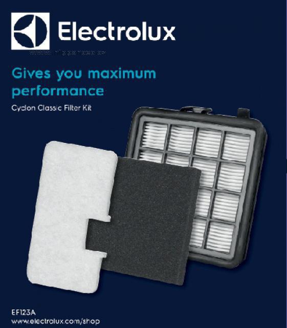 HEPA filtr Electrolux EF123ONLINE k vysavačům Series 99 Sada filtrů EF123ONLINE to jsou originální filtry k Series 99 pro cyklonové (bezsáčkové vysavače) - AEG, ELECTROLUX, PROGRESS, TORNADO, ZANUSSI k modelům EAPC51lS, EAPC52LR, EAPC53lS, EAPC54lW, PROGRESS PC1910EL,PC1930EL, ZANUSSI ZAN1900 EL, ZAN1910EL, ZAN1920EL, ZAN1930EL, ZAN1940EL, TORNADO TO1900EL, TO1910EL. Sada obsahuje mikrofiltr s výkrojem, houbový - pěnový filtr, a HEPA filtry - Hygiene filtr omyvatelný - do prachové nádoby.