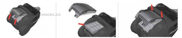 Čistění HEPA filtru u vysavačů AEG-Electrolux. Aby zůstal zachován výkon vysavače a bylo zajištěno dosažení optimálního vyčištění, je výrobcem doporučeno omýt omývatelný filtr buď jednou za rok nebo v případě, je-li viditelně znečistěn. Lehkým poklepem z něj odstraňte hrubé nečistoty. Filtr opláchněte vodou. Otáčejte jím několik minut pod vlažnou vodou (bez použití čistících prostředků). Nedotýkejte se přitom povrchu filtru, ani ho neoškrabujte. Před vrácením do vysavače nechte filtr úplně uschnout. POZOR! Před vrácením do vysavače musí být filtr úplně suchý. Mokrý filtr může poškodit vysavač nebo ovlivnit jeho výkon. Výměna sady filtrů v bezsáčkovém vysavači AEG-Electrolux: