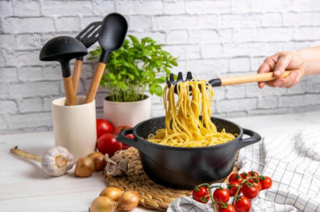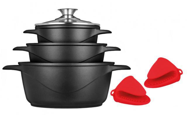 3 x hrnec, 3 x poklička, 2 x silikonová chňapka, vhodné i pro indukční ohřev.