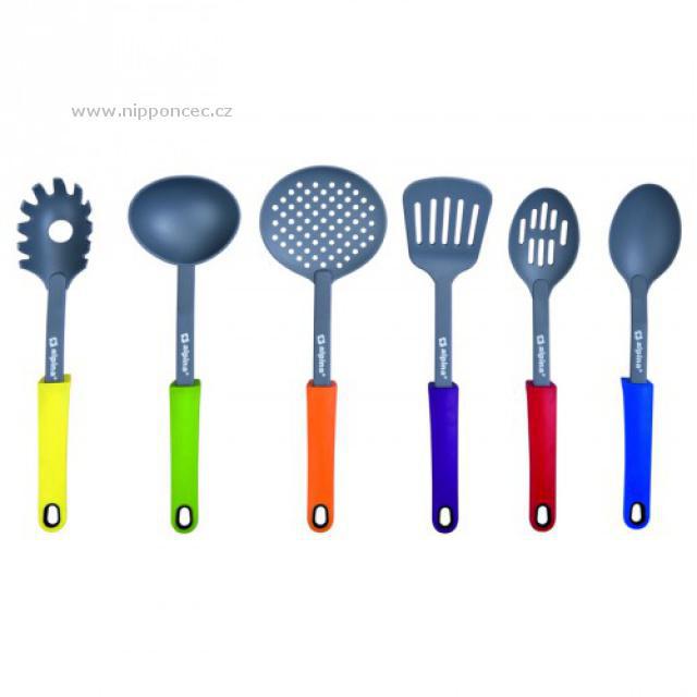 Sada kuchyňského náčiní se stojanem Alpina 22709 pro každodenní vaření. Náčiní je vyrobeno z nylonu. Nylon má mnohem vyšší tepelnou odolnost než dřevěné kuchyňské náčiní (vysoká odolnost vůči bakteriím). Údržba nylonového náčiní je velmi snadná, povrch se snadno čistí a lze umývat i v myčce na nádobí. Otočný stojan zajistí pohodlný výběr požadovaného náčiní. Sada obsahuje: naběračku, obracečku, lžíci s drážkami, servírovací lžíci, lžíci na těstoviny, pěnovačku.