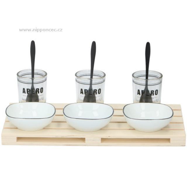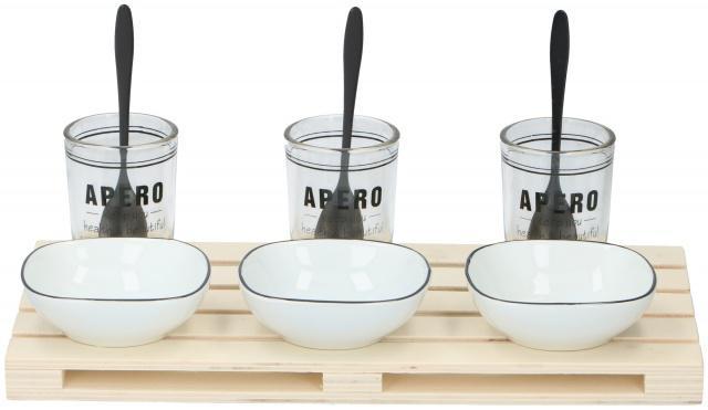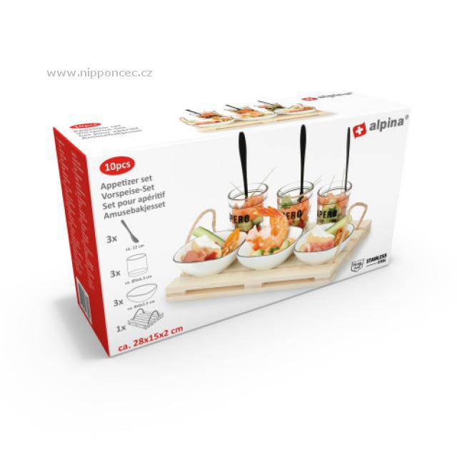 Stylová sada na předkrmy Alpina 17380 obsahuje 3x nerezová lžička, 3x sklenka, 3x keramická miska a 1x dřevěný podnos s úchyty. Vhodná na rodinné oslavy, setkání přátel či na slavnostní večírky. Bude užitečná při servírování dipů, omáček i občerstvení, jako jsou olivy, rajčata, sýry. Misky můžete použít například pro estetické servírování.