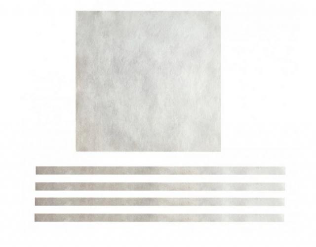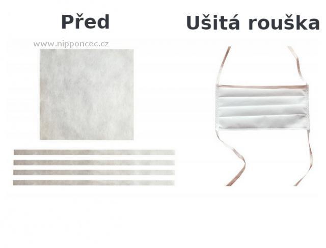 Sada pro výrobu roušek je připravena z materiálu primárně určeného k výrobě sáčků do vysavačů filtrační třídy F. Sada obsahuje 100 ks přířezů o rozměru 24x24 cm, 400 ks vázacích tkalounů o rozměru 2x40 cm. Vyrobeno z netkané textilie typu Spunbond / Melt-Blown / Spunbond (SMS), 100 % PoP, plošná hmotnost 60g / m2. Barva bílá natural, hydrofobní.