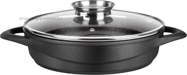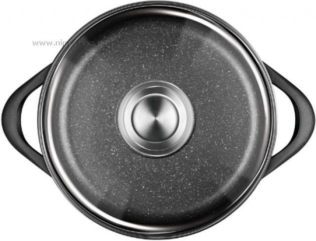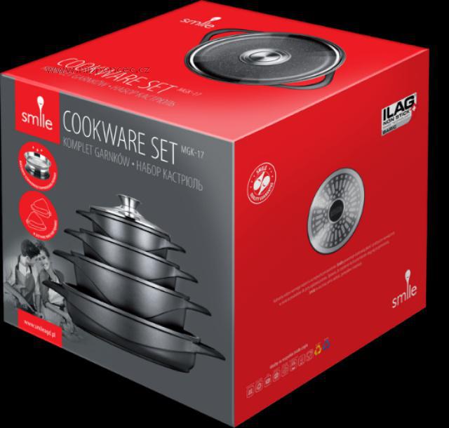 Sada hrnců a kastrolu s pokličkami KLUGE Smile MGK-17 je vhodná pro plynové, sklokeramické i indukční plotny. Hrnce včetně rukojetí jsou hliníkovým odlitkem s tlustým sendvičovým dnem, pokličky jsou skleněné a jsou opatřeny nerezovými úchyty a parními ventilky. Vícevrstvé dno svým složením a konstrukcí zaručuje perfektní rovnoměrný rozvod tepla po celé ploše. Hrnce jsou pokryty špičkovým nepřilnavým povrchem ILAG BASIC Swiss Technology. Součástí sady jsou i dvě silikonové chňapky pro bezpečnou manipulaci s hrnci.